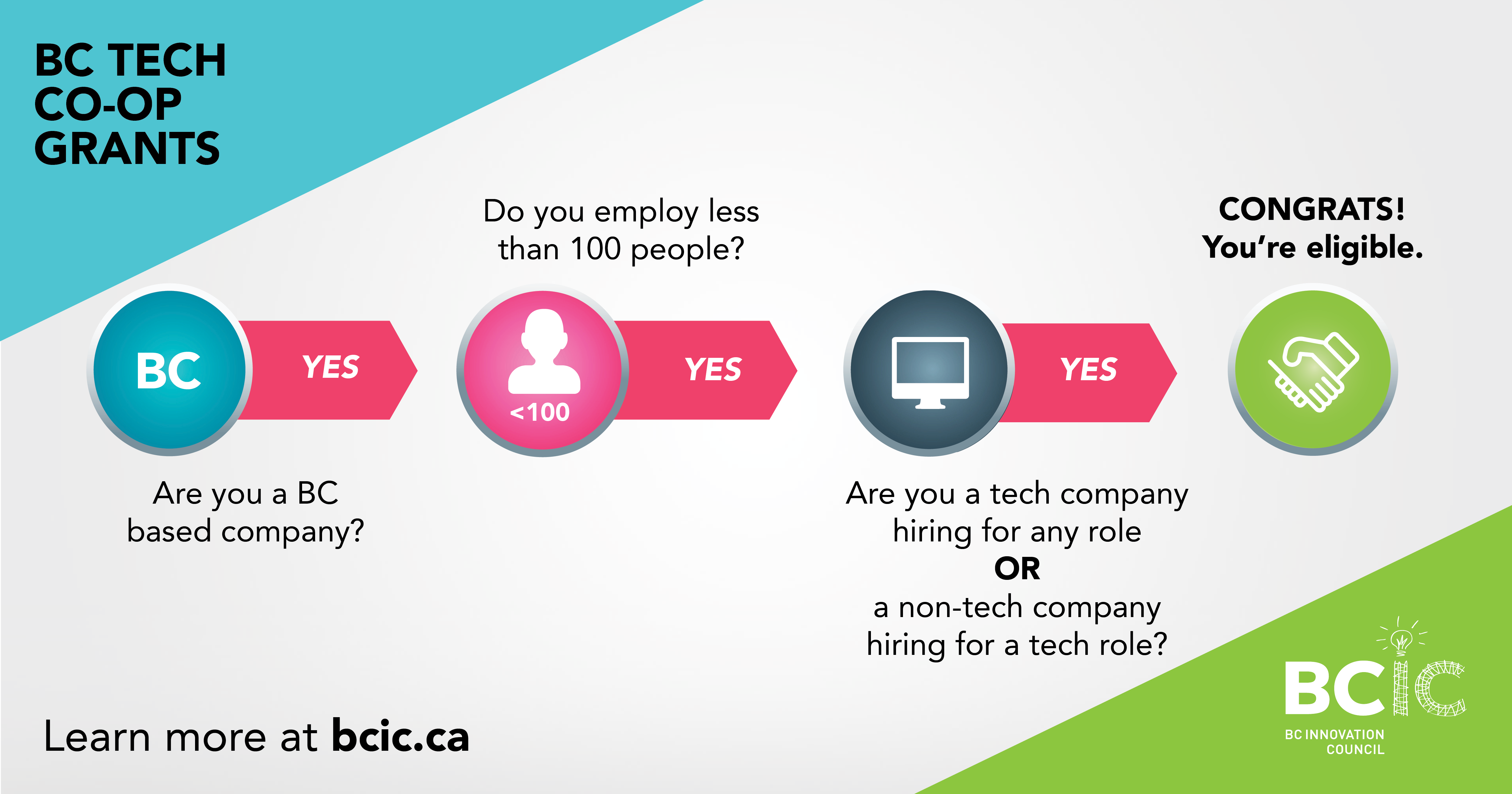 With the BC Innovation Council’s BC Tech Co-op Grants Program, companies can apply for up to four grants per year, each for $2,700, to use towards their co-op’s salary. That translates to up to $10,800 per year!
