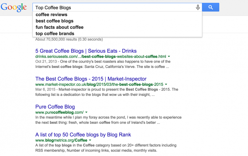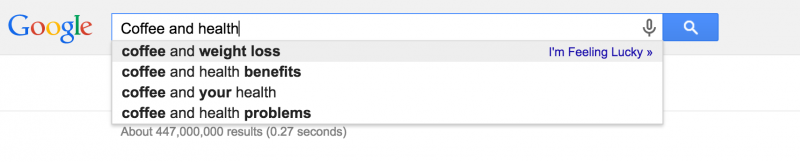 The trick is to put yourself in your client’s shoes and think about what type of content they would like to see. Search for the phrases you use to describe your category of products. For example, typing in “Coffee and Health” prompts Google to auto-suggest “Coffee and Weight Loss” and a bunch of other interesting topics. Read the articles in the search results and get a sense of what kind of content resonates with people.