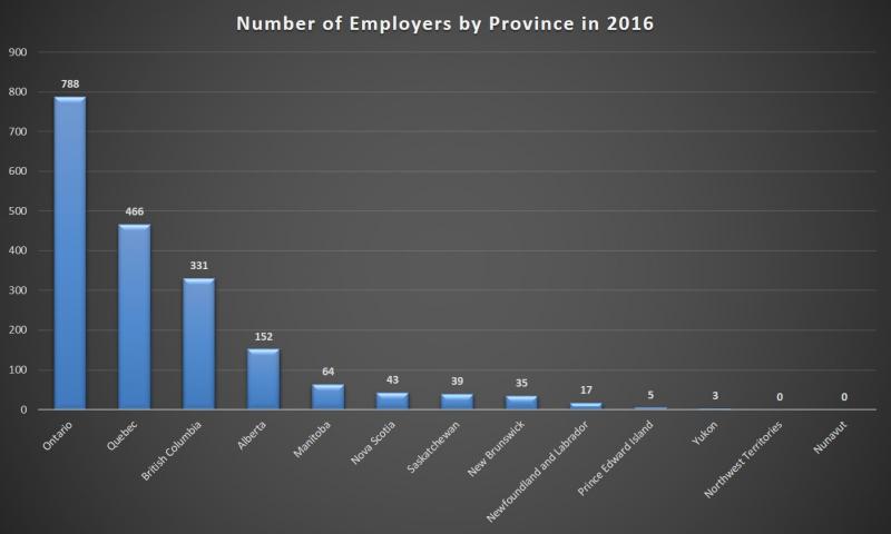 In 2016, 81.4% of industry employers were located in three provinces: Ontario, Quebec, and British Columbia. Quebec was Canada’s top employer with a total of 788 establishments that year.