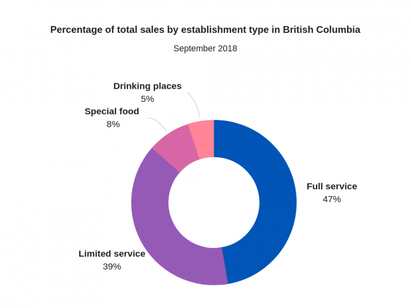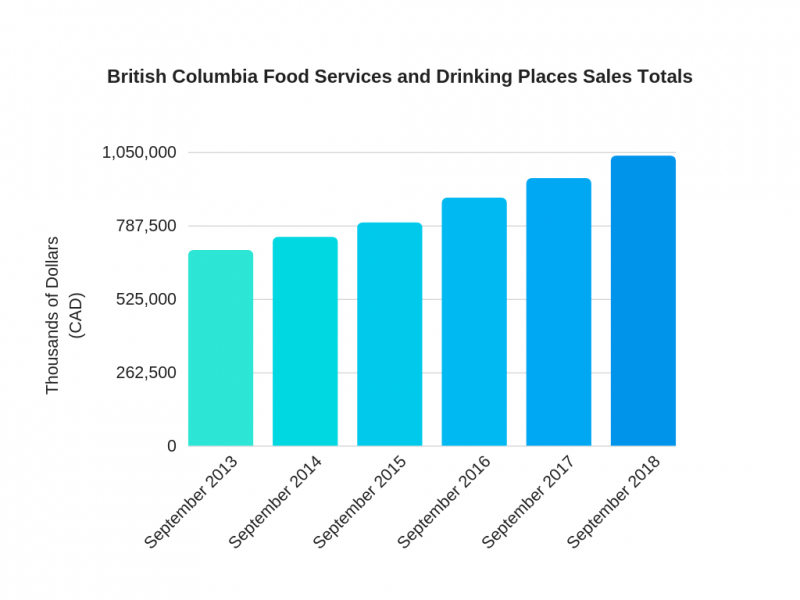 - As of September 2018, BC food services and drinking place sales totalled $1,038,023,000 (Statistics Canada)