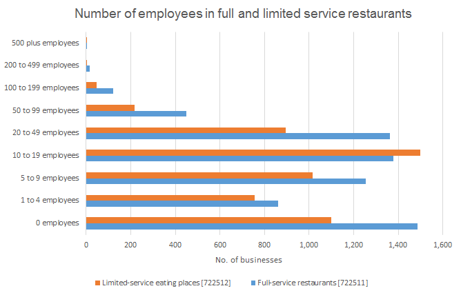 Reflecting the low concentration within this industry, the vast majority of both full service (92%) and limited service restaurants (95%) in British Columbia have fewer than 49 employees.