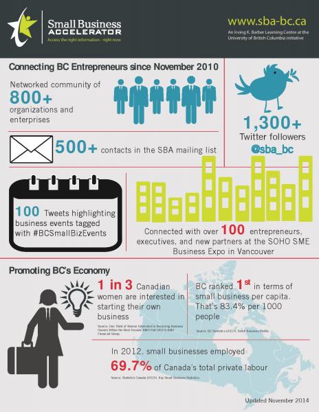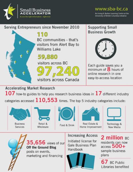 We're excited to present an updated version of our infographic and showcase some of our key accomplishments over the last three years of the SBA program! We have created this to reach out to our diverse audience of prospective entrepreneurs, small businesses, librarians working in public and academic libraries, colleagues in business support organizations, educators and students at UBC and beyond.